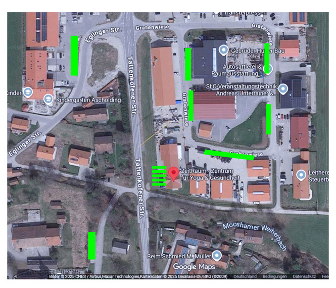 Bitte nutze ausschließlich die grün markierten Parkplätze auf dem Plan.